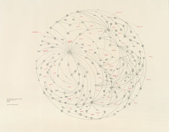Mark Lombardi (1951-2000) created carefully planned drawings that document extensive networks of influence, money, and power, attempting to clarify the often complicated financial connections among individuals, governments, and other institutions. His extensively researched diagrammatic compositions establish and illustrate connections between key figures involved in political and financial scandals. Working as a library archivist for most of his life, Lombardi began illustrating his research just six years before his death. In 2012, German director Mareike Wegener released a documentary on Lombardi, Mark Lombardi: Death-Defying Acts of Art and Conspiracy.