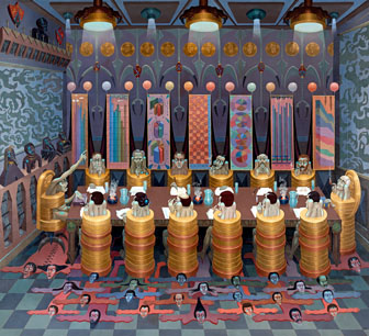 Irving Norman, Meeting of the Elders 3, 1977, oil on canvas, 90 x 100 inches, Tang Teaching Museum on extended loan from The Collection of Marlene and Alan Gilbert, image courtesy of Michael Rosenfeld Gallery, LLC, New York, NY