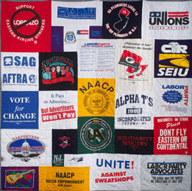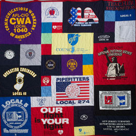 Andrea Funk, Untitled (for Local 14 Teamsters), t-shirt quilt, 51 x 57 1/2 inches, American Labor Museum/ Botto House National Landmark, Haledon, New Jersey