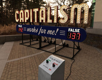 Steve Lambert, Capitalism Works For Me! True/False, 2011, aluminum, lights, wood, electronics, 20 x 9 x 7 feet, courtesy of the artist and Charlie James Gallery, Los Angeles
