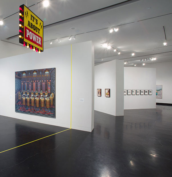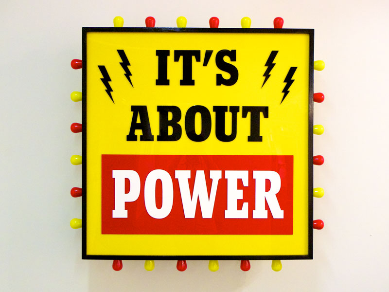 Steve Lambert, It's About Power, 2011, laser-cut acrylic, wood, lights, 36 x 36 inches, courtesy of the artist and Charlie James Gallery,