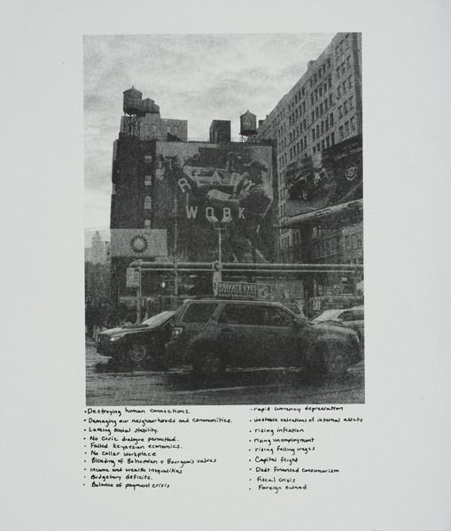 Steve Lambert (b. 1976) works in performance, sculpture, internet art, and other media. His often-participatory art asks viewers to assess the society in which they live and explores the power structures in American society. Founder of the Anti-Advertising Agency, Lambert uses the language, look, and feel of advertising to explore issues of consumption, capitalism, class, and media. Deceptively simple, Lambert's "signs" invite viewers into a larger conversation about the efficacy of American social structures.