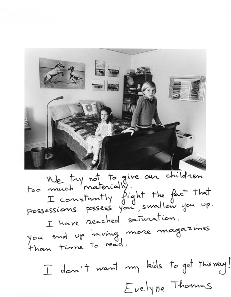 Jim Goldberg, We try not to give our children too much materially, from Rich and Poor, 1981/83, gelatin silver print, 11 x 14 inches, courtesy of the artist and Stephen Wirtz Gallery