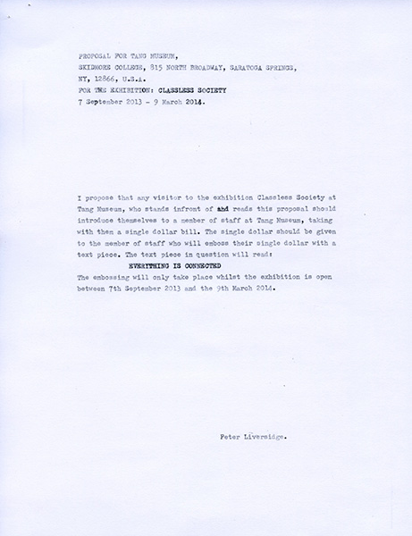 Conceptual artist Peter Liversidge (b. 1973) creates proposals for performances and artworks across a wide range of media. Ranging from the possible to the hypothetical, Liversidge's proposals, typed on an old manual typewriter, hang in the exhibition; over the course of Classless Society, selected proposals will become realized. Liversidge's proposals actively engage the place for which he creates them, often highlighting that community's economic disparity and social issues. Liversidge believes his works require the viewers' unique interpretations to complete them, and his proposals often ask viewers to interact with others or their surroundings in ways designed to stimulate new perceptions and connections.