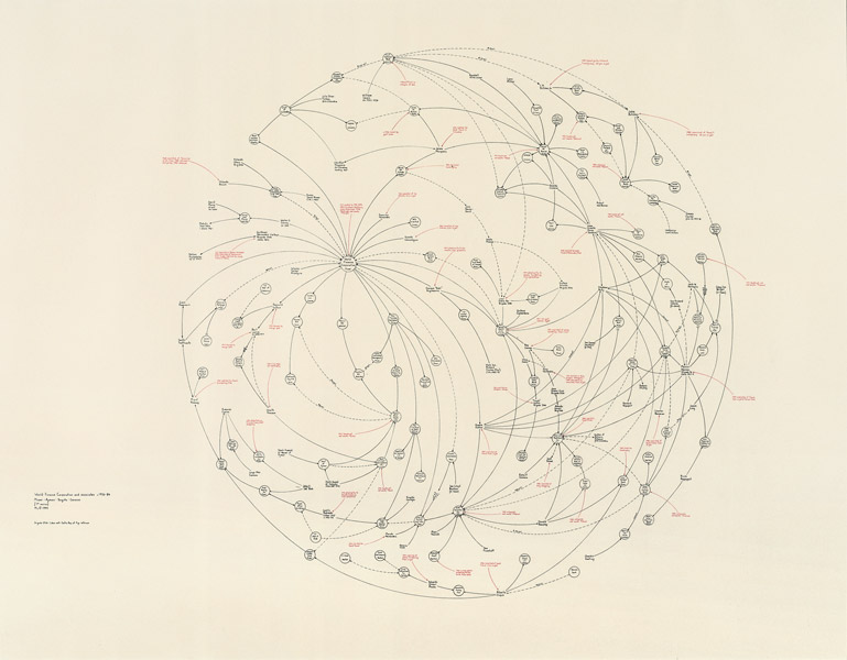 Mark Lombardi (1951-2000) created carefully planned drawings that document extensive networks of influence, money, and power, attempting to clarify the often complicated financial connections among individuals, governments, and other institutions. His extensively researched diagrammatic compositions establish and illustrate connections between key figures involved in political and financial scandals. Working as a library archivist for most of his life, Lombardi began illustrating his research just six years before his death. In 2012, German director Mareike Wegener released a documentary on Lombardi, Mark Lombardi: Death-Defying Acts of Art and Conspiracy.