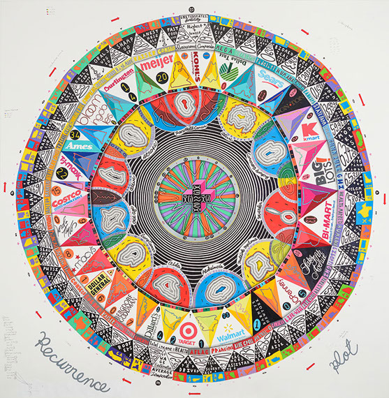 John O'Connor (b. 1972) is known for his large-scale drawings in which he creates psychedelic patterns from carefully chosen and often self-compiled data. Inspired by scientific discoveries, news headlines, and phenomena such as lottery success or weight fluctuation, O’Connor presents these data sets in novel ways, building new relationships between them. In A Recurrence Plot, commissioned for Classless Society, O'Connor attempts to measure class in a tangible, visual way. The work was inspired by a conversation between the artist and a doctor in which the doctor equated a person's healthcare rights with a shopping experience. Organized like a diagram of the earth's layers from crust to core, the drawing maps a person's life cycle from birth to death through a class-inflected lens.