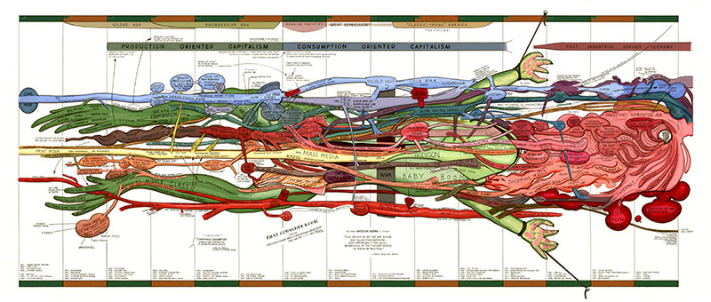 Artist Ward Shelley’s (b. 1950) drawings in toner and acrylic on Mylar explore the histories of social movements through precisely drawn, slightly cartoonish timelines or flow charts. Shelley’s diagrammatic paintings serve as pictorial narratives, unfolding his often complex ideas about the connections and influences between people, social movements, organizations, artistic movements, and more. Shelley likens facts to dots on a graph and his narrative to the curve that connects them and gives isolated data points meaning. Work, Spend, Forget, commissioned for Classless Society, charts the history of twentieth century labor and consumption, tracing a path from production-oriented capitalism to consumption-oriented capitalism.