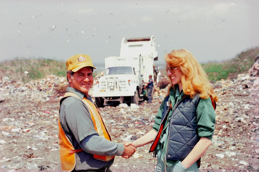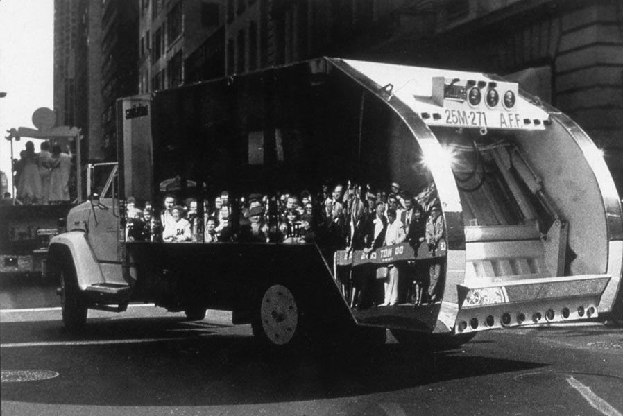 Mierle Laderman Ukeles, Touch Sanitation Performance, 1977-1980, "Handshake Ritual" with workers of New York City Department of Sanitation, color photograph, 60 x 90 inches, courtesy Ronald Feldman Fine Arts, New York